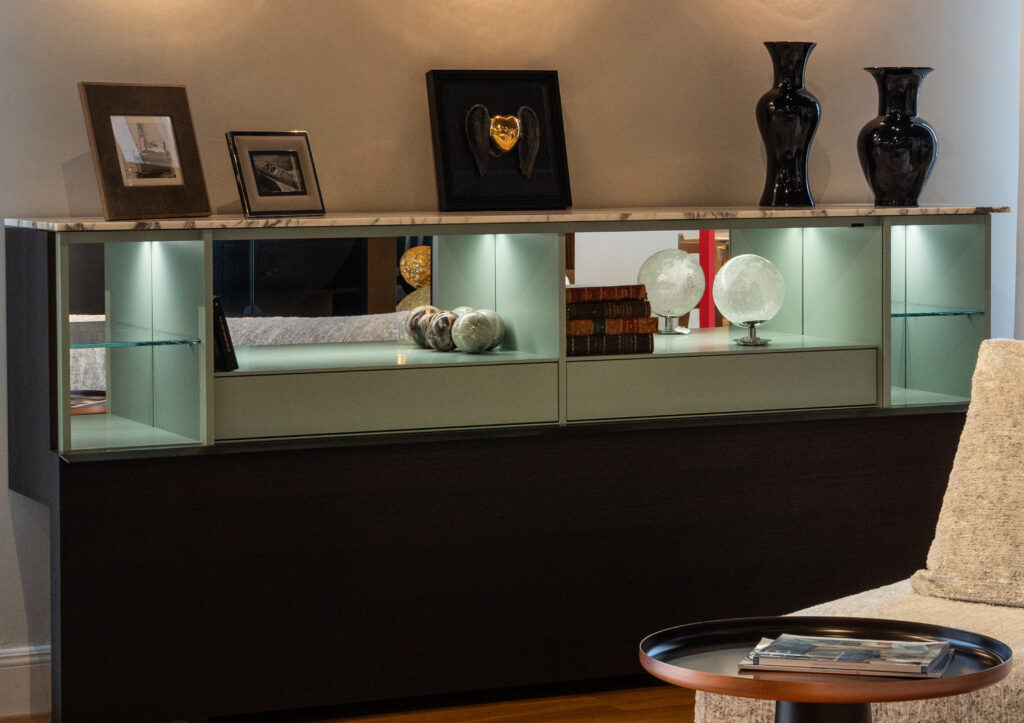 Cucina Modulnova mod. Blade Lab, isola in Pietra Amarula con tavolo penisola in Eucalipto, colonne con anta alluminio Blade Black Dust, elettrodomestici Gaggenau